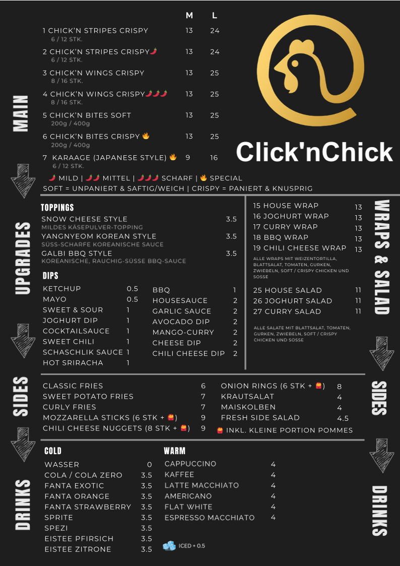 In der Schlosspassage Usingen lädt Click’nChick zu einer heißen, knusprigen Auszeit ein. Außen goldbraun und kross, innen zart und saftig – hier warten frisch zubereitete Hähnchenspezialitäten in vielen Varianten auf dich. Besonders beliebt sind die reich gefüllten Wraps mit zartem Geflügel, knackigem Salat und würzigen Saucen, dazu klassische Lieblingsbeilagen wie knusprige Pommes und weitere herzhafte Extras, die jeden Hunger stillen.